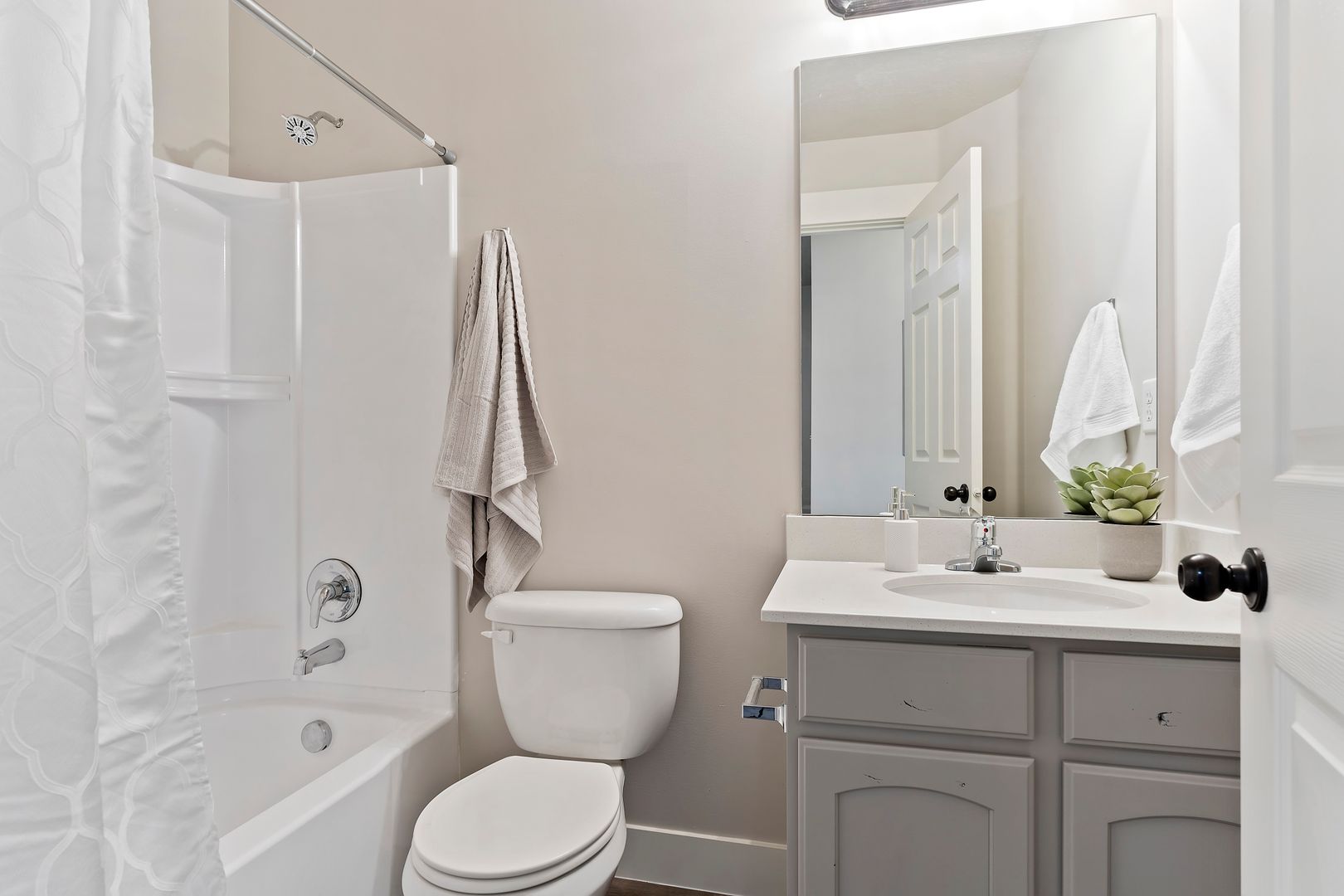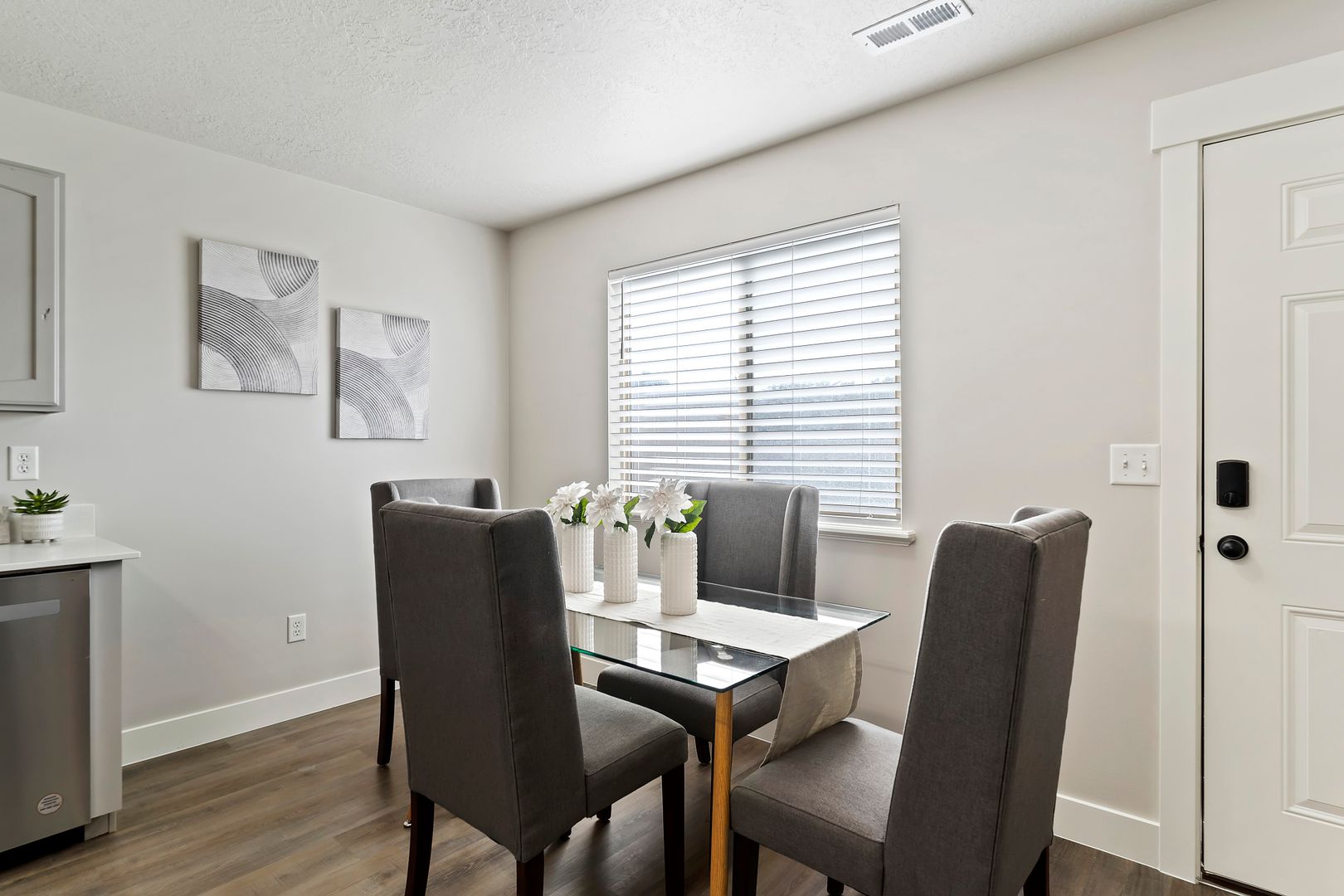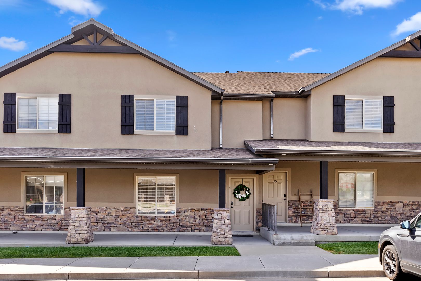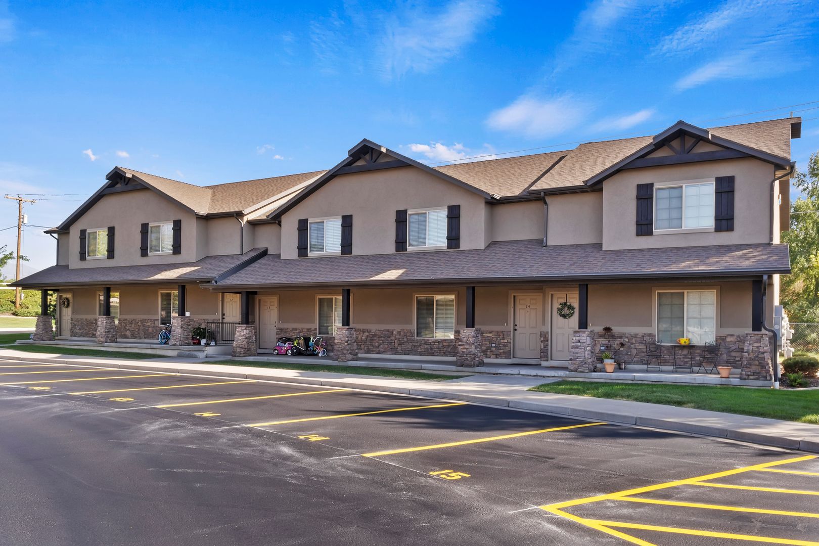 Our upscale 3 bedroom/2.5 townhomes come complete with elegant interiors and modern finishes. Each beautiful kitchen showcases a large pantry, abundant cupboard space, and a galley kitchen island. Our pet-friendly townhomes have private back-patios with luscious green lawns, stylish front-porches, liberal parking, a private playground, and immaculate landscaping.